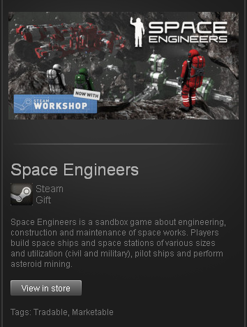 МОМЕНТАЛЬНО ПОСЛЕ ОПЛАТЫ ВЫ ПОЛУЧАЕТЕ ССЫЛКУ НА АКТИВАЦИЮ ГИФТА Space Engineers в Steam **Этот подарок может быть активирован только в этих странах: Армения, Азербайджан, Республика Беларусь, Грузия, Киргизстан, Казахстан, Республика Молдова, Таджикистан, Туркменистан, Узбекистан, Украина, Россия. **This is a restricted gift which can only be redeemed in these countries: Armenia, Azerbaijan, Belarus, Georgia, Kyrgyzstan, Kazakhstan, Moldova, Republic of, Tajikistan, Turkmenistan, Uzbekistan, Ukraine, Russian Federation Об игре: Space Engineers is a sandbox game about engineering, construction and maintenance of space works. Players build space ships and space stations of various sizes and utilization (civil and military), pilot ships and perform asteroid mining. Space Engineers utilizes a realistic volumetric-based physics engine: all objects can be assembled, disassembled, damaged and destroyed. Volumetric objects are structures composed from block-like modules interlocked in a grid. Volumetric objects behave like real physical objects with mass, inertia and velocity. Individual modules have real volume and storage capacity. Space Engineers is inspired by reality and by how things work. Think about modern-day NASA technology extrapolated 60 years into the future. Space Engineers strives to follow the laws of physics and doesn´t use technologies that wouldn´t be feasible in the near future. Space Engineers concentrates on construction aspects, but can be played as a tactical shooter as well. We expect players to avoid engaging in direct man-to-man combat and instead use their creativity and engineering skills to build war machines and fortifications. Space Engineers shouldn’t be about troops; it should be about the machinery you build. После покупки необходимо: 1. Скачать и установить Steam http://steampowered.com/about (если еще не установлен); 2. Зарегистрировать новый аккаунт в Steam или зайти в существующий; 3. Полученную после покупки ссылку, необходимо скопировать и вставить в ваш интернет браузер, авторизоваться под своей учётной записью Steam и ПРИНЯТЬ подарок себе в БИБЛИОТЕКУ (т.е. активировать на аккаунт) или ПРИНЯТЬ и добавить в ИНВЕНТАРЬ (т.е. подарок можно будет кому-нибудь передать); 4. После активации игра появится в списке игр и вы сможете скачать ее со steam, а затем начать играть. _____________ Все гифты покупаются только официальным путем (трейдабельные или нетрейдабельные гифты) All gifts are bought a legal way (tradable or untradable gifts) |