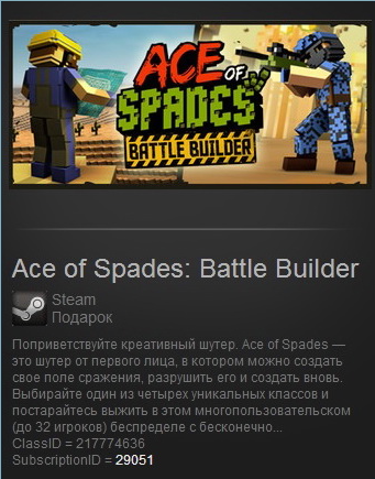 | Вы покупаете официальный Steam Gift (подарок) активации игры Ace of Spades Battle Builder (Steam Gift / Region Free). После оплаты товара Вы получаете ссылку для активации игры, при переходе по которой Вы сможете принять подарок в БИБЛИОТЕКУ или добавить в ИНВЕНТАРЬ. Также дубликат ссылки на страничку с гифтом придёт на почту, указанную при покупке. Активация Gift´a (подарка) : 1. Скачать и установить Steam http://steampowered.com/download/SteamInstall.msi (если еще не установлен) 2. Зарегистрировать новый аккаунт в Steam или зайти в существующий. 3. Скопировать, полученную после покупки ссылку и вставить в Ваш интернет браузер, авторизоваться под своей учётной записью Steam и принять подарок себе в БИБЛИОТЕКУ или добавить в ИНВЕНТАРЬ. 4. После активации игра появится в списке игр и вы сможете скачать ее со Steam. ***************************************************** Надеемся, Вам понравится наш сервис и Вы оставите положительный отзыв о нас и о товаре. Благодарим за покупки! ***************************************************** |