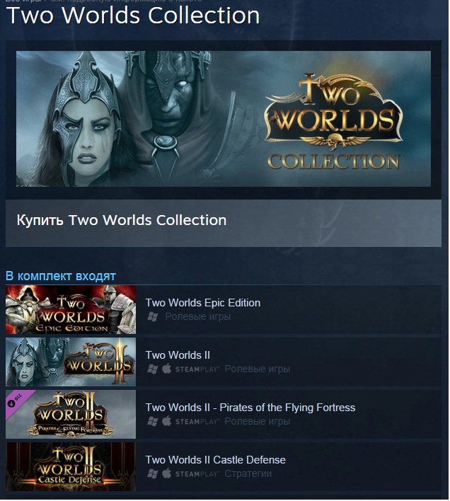 Название: Two Worlds Collection Жанр: Ролевые игры, Стратегии Разработчик: Reality Pump Studios Издатель: Topware Interactive Дата выхода: 21 ноя, 2012 Активация Steam Купив данный товар, вы получаете gift - ссылку для активацию игры в Steam. ОБ ИГРЕ В комплект входят 4 игры: 1. Two Worlds Epic Edition 2. Two Worlds II 3. Two Worlds II - Pirates of the Flying Fortress 4. Two Worlds II Castle Defense |