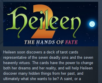 http://store.steampowered.com/app/305480/ Heileen 2 - продолжение первой части Heileen о приключениях девушки по имени Хейлин. Игра начинается с того, что после кораблекрушения вы оказались на острове с выжившими друзьями и котом. Хейлин натыкается на колоду карт Таро, которые представляют семь смертельных грехов и семь небесных достоинств. Позже героиня обнаруживает, что у этих карт есть власть изменить и ее мечты и ее реальную жизнь. В игре 15 различных концовок и 20 побочных квестов. |