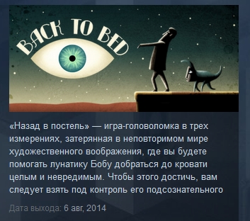 http://store.steampowered.com/app/308040/ «Назад в постель» — игра-головоломка в трех измерениях, затерянная в неповторимом мире художественного воображения, где вы будете помогать лунатику Бобу добраться до кровати целым и невредимым. Чтобы этого достичь, вам следует взять под контроль его подсознательного хранителя по имени Подбоб. Эта парочка путешествует по сюрреалистическому, живописному миру сна, наполненного объектами, которые будут направлять Боба в постель, но также и опасностями, которых необходимо избегать! Особенности ★ Уникальная вселенная игры, сочетающая сюрреализм и художественный вымысел Cтранная, но пленительная среда, в которой смешиваются элементы реального мира и мира сновидений для создания нечто уникального, сюрреалистического и иногда немного страшного. ★ Изометрические уровни игры Путешествуйте по подробным трехмерным головоломкам, бросающим вызов законам физики, из-за чего игрок должен действовать в диковинной обстановке, пытаясь создать безопасный путь для Боба и избежать опасностей. ★ Раздваивающийся герой Играйте за воплощенное подсознание в виде небольшого существа-хранителя, пытаясь спасти свое тело лунатика от опасностей мира снов. ★ Живописный визуальный стиль Откройте для себя ощущение игры в произведении искусства, воплощенного в цифровую форму. Визуальный стиль вдохновлен методами ручной росписи, сюрреалистическим искусством и невозможными формами. ★ Режим кошмара Pазблокируйте более сложную версию игры, созданную для тех, кто действительно хочет проверить навыки решения головоломок и любит анализировать на много шагов вперед, или для тех, кто просто слишком упрям, чтобы сдаться. |