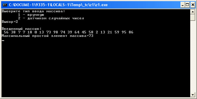 Лабораторная работа в pascal. Тема - Массивы. Задание: Дан одномерный целочисленный массив А состоящий из N элементов (0<N<10000;10000<A[i]<10000). Найти наибольший среди элементов массива А, являющихся простыми числами. Пример: Выберите тип ввода массива: 1 - вручную 2 - датчиком случайных чисел Выбор=2 Введенный массив: 51 37 42 35 81 82 91 52 72 9 12 93 8 81 42 93 64 1 20 61 Максимальный простой элемент массива=61 |