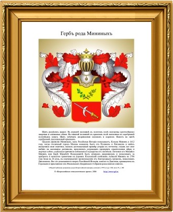 | ...Предокъ фамилiи Мининыхъ, какъ Россiйская Исторiя показываетъ, Козьма Мининъ в 1612 году, когда столичный городъ Москва осажденъ былъ отъ Поляковъ и Литовцевъ и имѣлъ внутреннiя свои смятенiя, оказалъ достохвальный примѣр усердiя къ отечеству, отдавъ все свое имѣнiе на жалованье ратниковъ, преклонилъ согражданъ предпрiять спасительныя мѣры и жертвуя собою, содѣлался причиною избавленiя Государства отъ погибели. Потомки его Михайло Мининъ при Царѣ Михайлѣ Феодоровичѣ былъ думнымъ дворяниномъ и пожалованъ за храбрость и мужество грамотами на деревни. Коллежскiй совѣтникъ Алѣксей Мининъ въ 1786 году Iюня въ 26 день, въ подтвержденiе происхожденiя отъ благородныхъ предковъ, пожалованъ Дипломомъ. Все сiе доказывается сверхъ Россiйской Исторiи, копiею съ Диплома, хранящеюся въ Герольдiи и присланною изъ Московскаго Дворянскаго Собранiя родословною книгою. Общий Гербовник дворянских родов Всероссийской империи, начатый в 1797-м году. СПб |