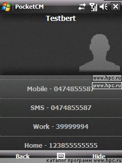 PocketCM (бывший ContactManager), как и следует из названия, это менеджер контактов. Изюминкой проекта является ориентированность на управление пальцами вместо стилуса. Нельзя не отметить, что при этом автор не занимается копированием элементов дизайна интерфейса iPhone, а создал собственный, хоть и очень простой, дизайн. Возможности программы PocketCM: - Просмотр и редактирование списка контактов - Избранные контакты - Самостоятельное изменение настроек через файл setting.ini (цвета, шрифты, фоновый рисунок) Совместимость/адаптация: Windows Mobile 5, Windows Mobile 6 Classic, Windows Mobile 6 Professional |