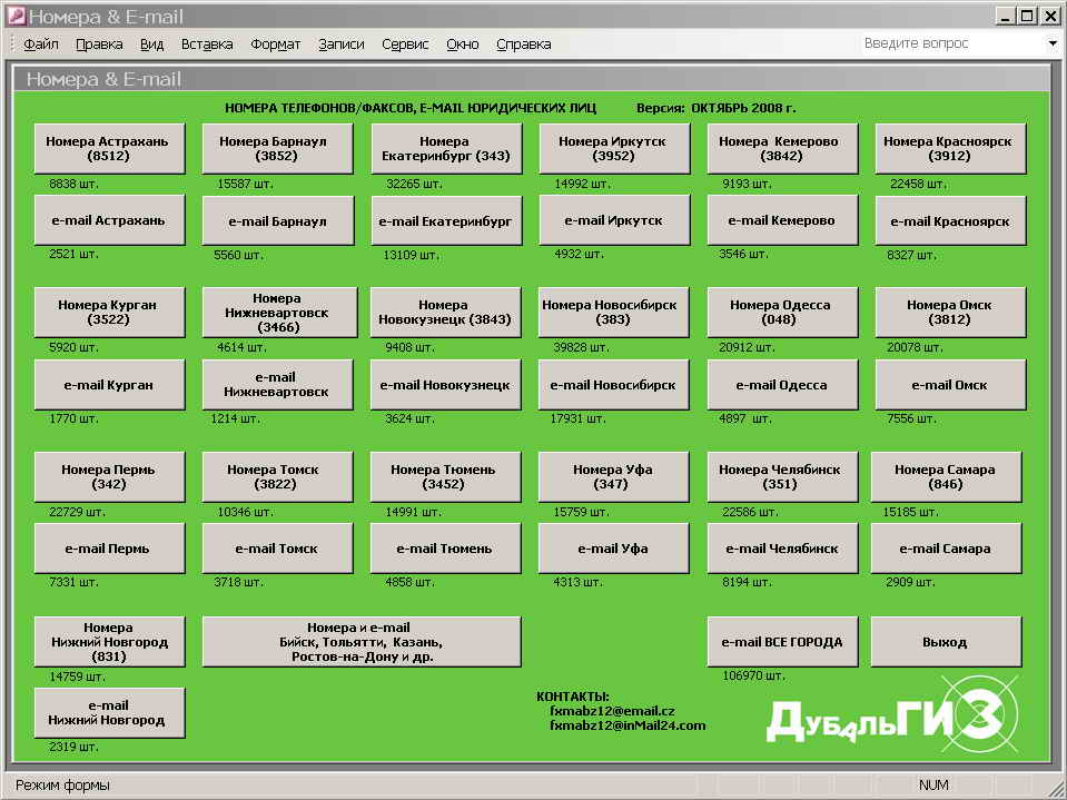 База содержит информацию о юридических лицах в 19 городах: название фирмы, адрес, email, номер телефона / факса, сфера деятельности предприятия. Формат базы MS Access 2000. Более 200.000 контактов в городах: Астрахань, Барнаул, Екатеринбург, Иркутск, Кемерово, Красноярск, Курган, Нижневартовск, Новокузнецк, Новосибирск, Одесса, Омск, Пермь, Самара, Томск, Тюмень, Уфа, Челябинск, Нижний Новгород. Любые выборки по сфере деятельности. Справочник поможет создать или увеличить клиентскую базу, выполнить почтовую / факсовую рекламную рассылку. Мы против спама и осуждаем использующих сборник для директ-мейла без согласия респондентов. Высокая эффективность каталога - все новые организации подают информацию о своих контактах в ДубальГИЗ и следят за их актуальностью. Перед покупкой ОБЯЗАТЕЛЬНО скачайте и посмотрите демонстрационную версию: http://narod.ru/disk/3269238000/demo1008.rar.html Наши клиенты получают обновления базы в первую неделю каждого месяца. Отдельные города можно купить здесь: http://www.plati.ru/asp/seller.asp?id_s=92495 |